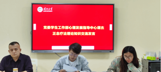 其次,由党委学生工作部心理发展指导中心谭杰进行以正念疗法理论知识分享为主题的发言,从正念背景、何为正念、如何练习正念、注意事项四个方面对正念疗法理论知识进行了详细介绍。