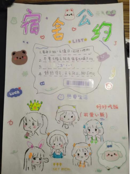 为进一步加强“三强三优”文明宿舍创建工作,营造团结、文明、和谐、友善的宿舍文化氛围,增强宿舍成员之间的凝聚力,促进大学生全面成长,人文学院开展“宿舍公约计划”活动,鼓励宿舍成员一起制定宿舍公约。各宿舍本着“用规则营造温馨氛围,用公约构建和谐宿舍”的原则,围绕宿舍生活秩序、宿舍财务、个人隐私、矛盾处理方式等内容制定宿舍公约,让宿舍成为一个有秩序的空间。通过“宿舍公约计划”活动,有效地帮助同学之间学会沟通、协商与合作,学会惜缘与感恩,学会律己与宽容,让宿舍成为大家共同的港湾,为同学们营造了良好的居住生活环境。